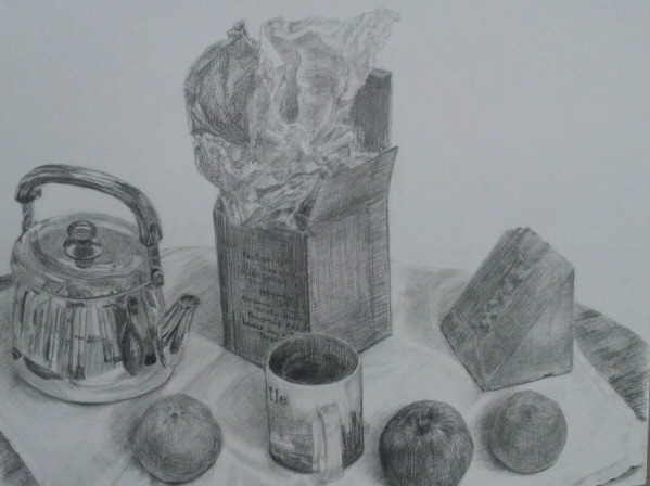 (追記)主役にしたい物を真ん中に。影の付け始めも主役から。影を付けるときには薄い色に合わせる傾向があるので濃い部分から。やかんみたいに映り込みがはっきりしているものはぼやけた描き方じゃなくはっきり描くこと。映っているものは実際のものよりも濃い目にするとそれっぽい(この絵のオレンジみたいな)