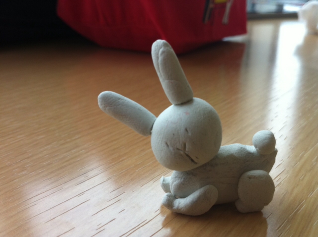 お昼に描いていた時に隣では練り消しを中国の料理人みたいに伸ばしたりこねたり、また兎にしていました。